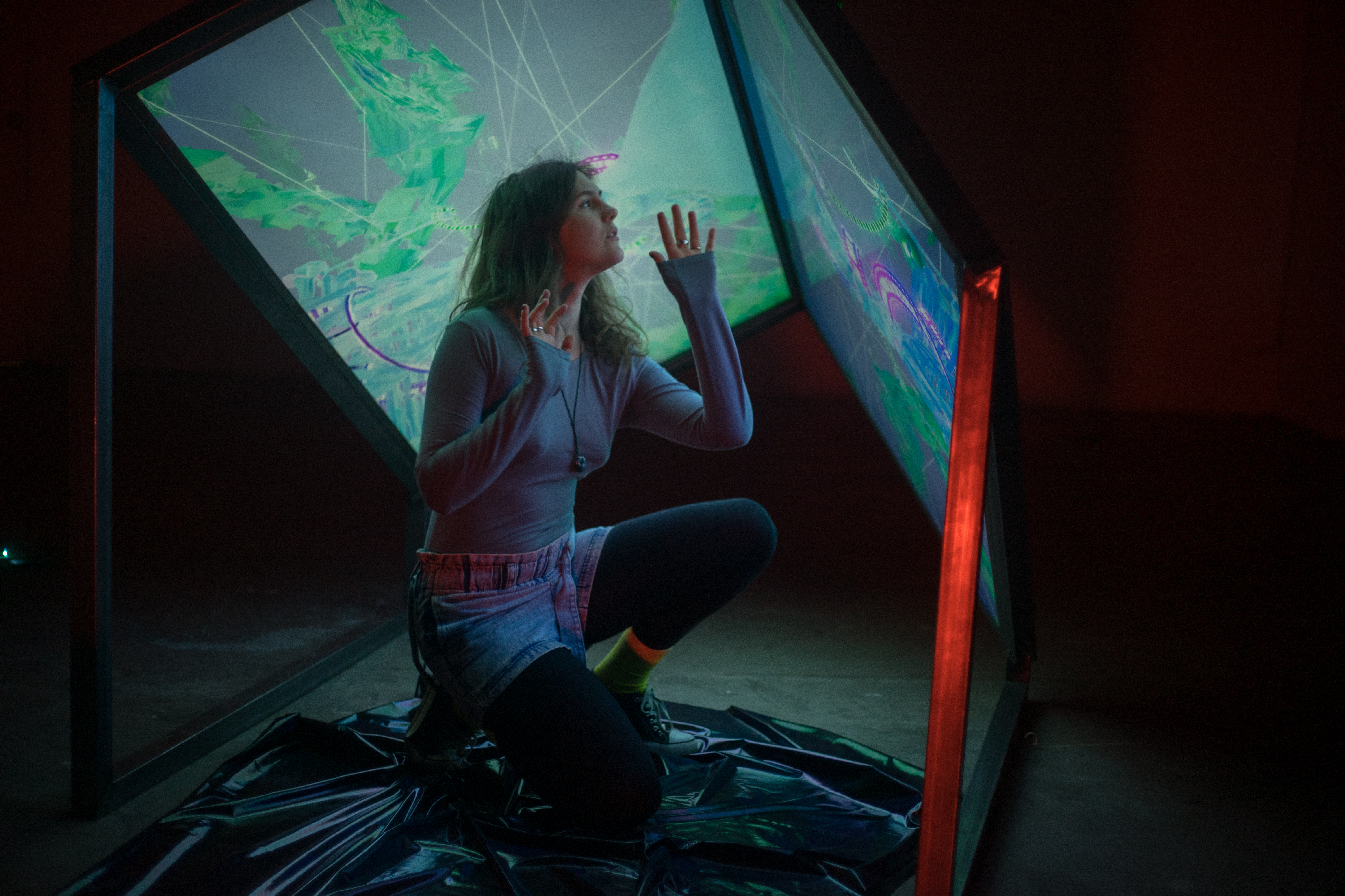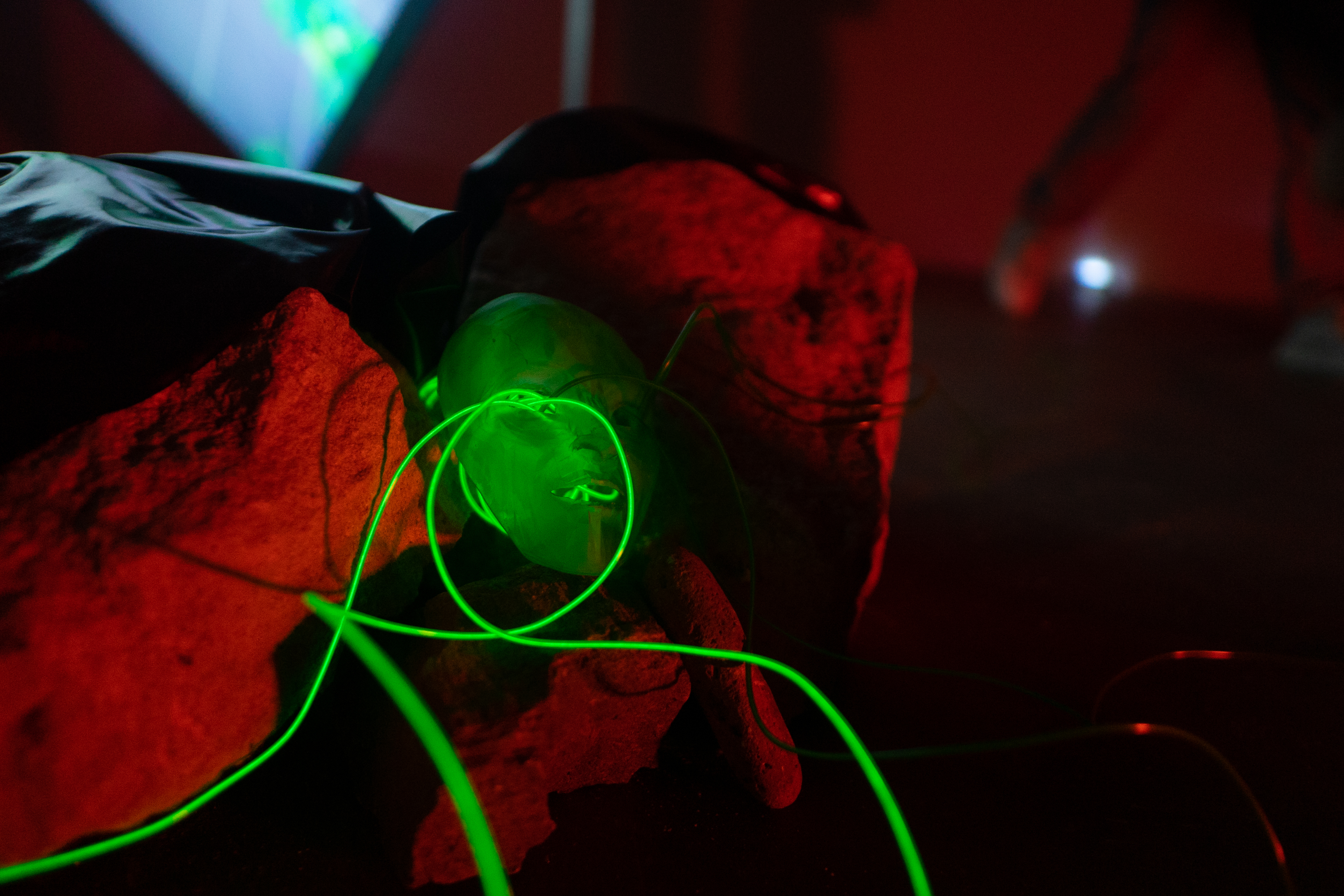 Components: TV 50” x2, Metal structure, Resin printed pieces, LED lines with the LED light, phone screen, reflective fabric. Size: 1.5 x 1 x 2.5m